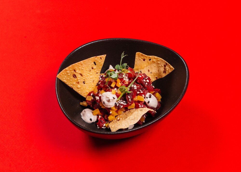 Говядина маринованная, дайкон маринованный, соус шитаки, папад, кунжут, микрозелень