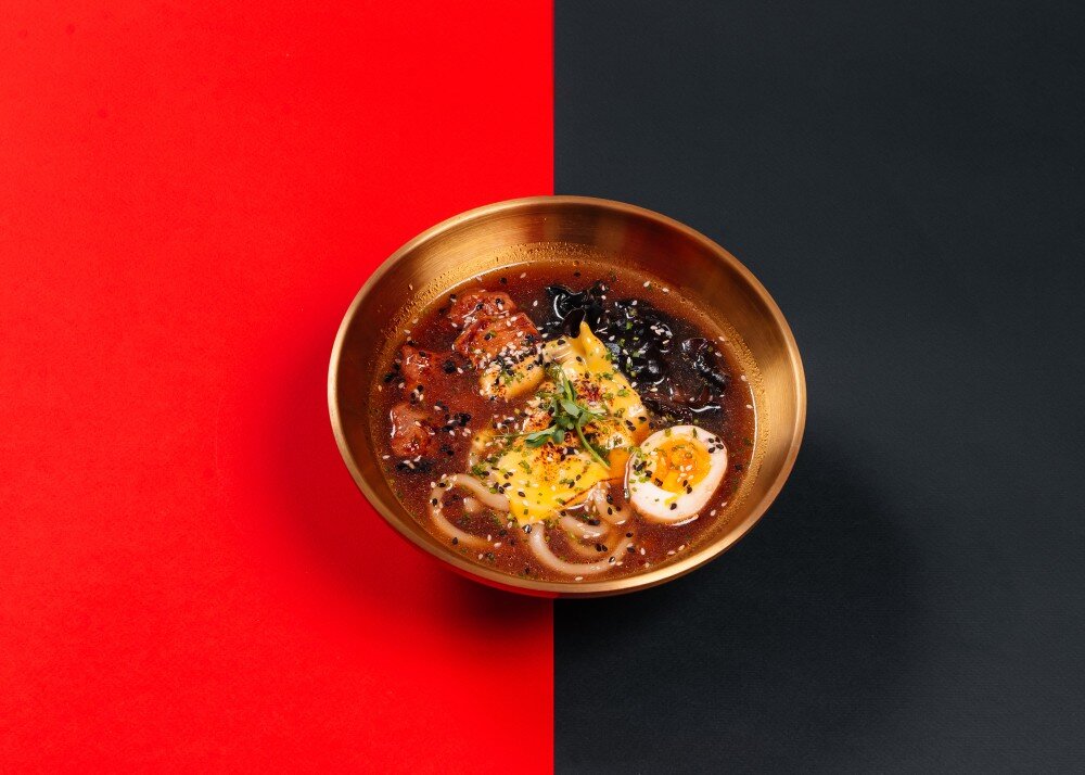 Свинина, чесночно-имбирное масло, удон, муэр, маринованное яйцо, сыр чеддер, лук зеленый