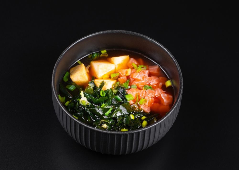 Лосось, тофу, вакаме, мисо-бульон, лук зеленый