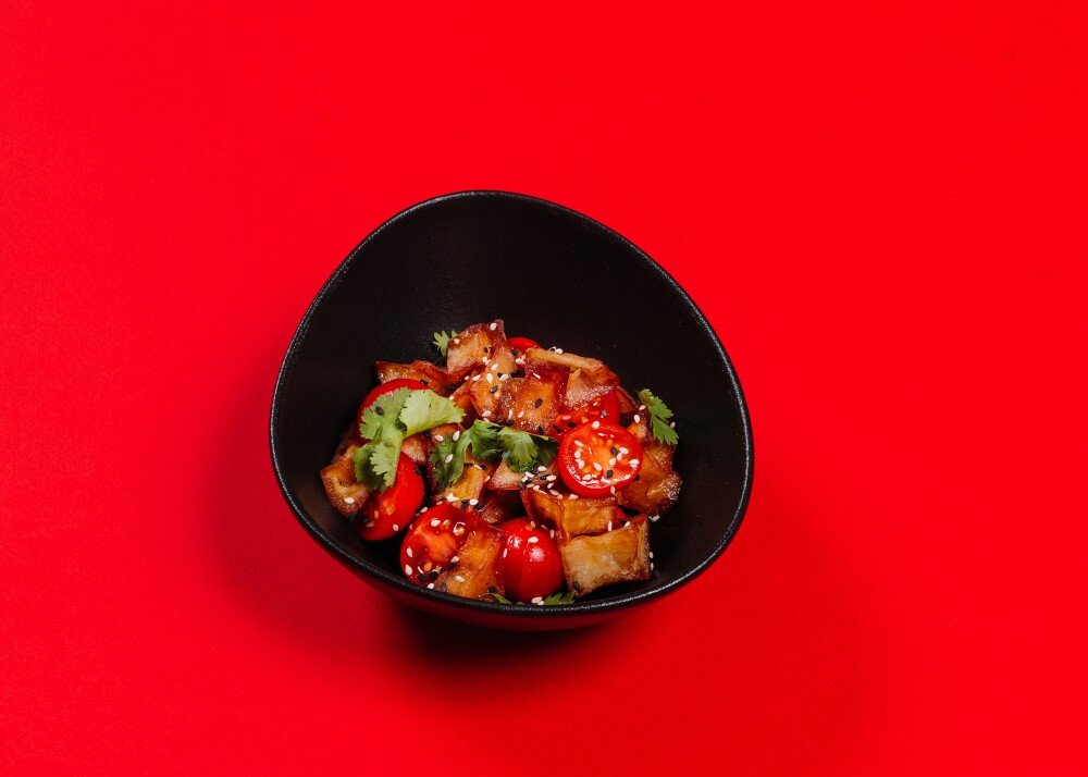 Баклажаны, черри, кинза, соевый соус, кунжут, сладкий чилли