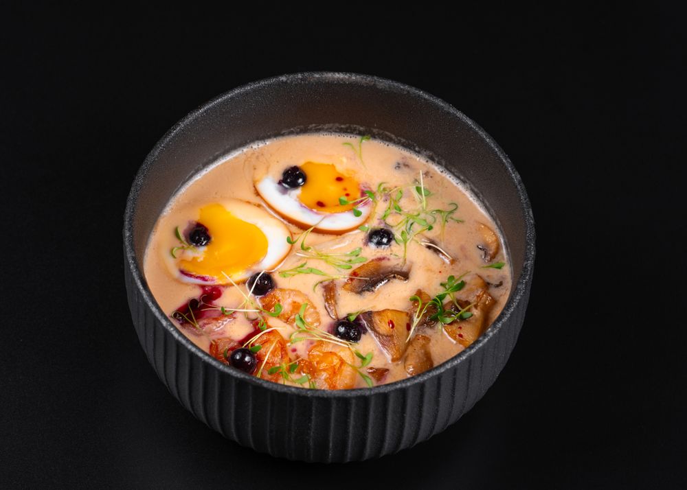 сырный бульон, креветки, шампиньоны, маринованное яйцо, ягодный соус, микрозелень, лапша