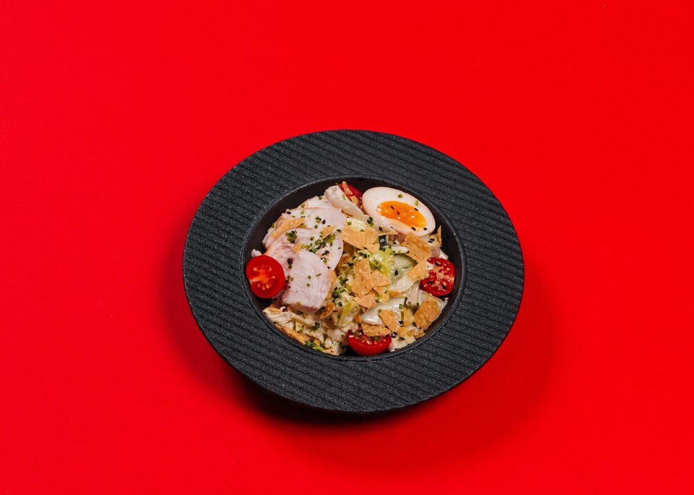 Пекинская капуста, айсберг, грудка в/к, авокадо, огурец, черри, маринованное яйцо, арахис, японский майонез, папад
