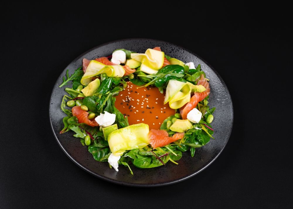 микс салата, лосось слабосоленый, сыр творожный, маринованный кабачок, брокколи, авокадо, эдамаме, кунжут, соус облепиховый