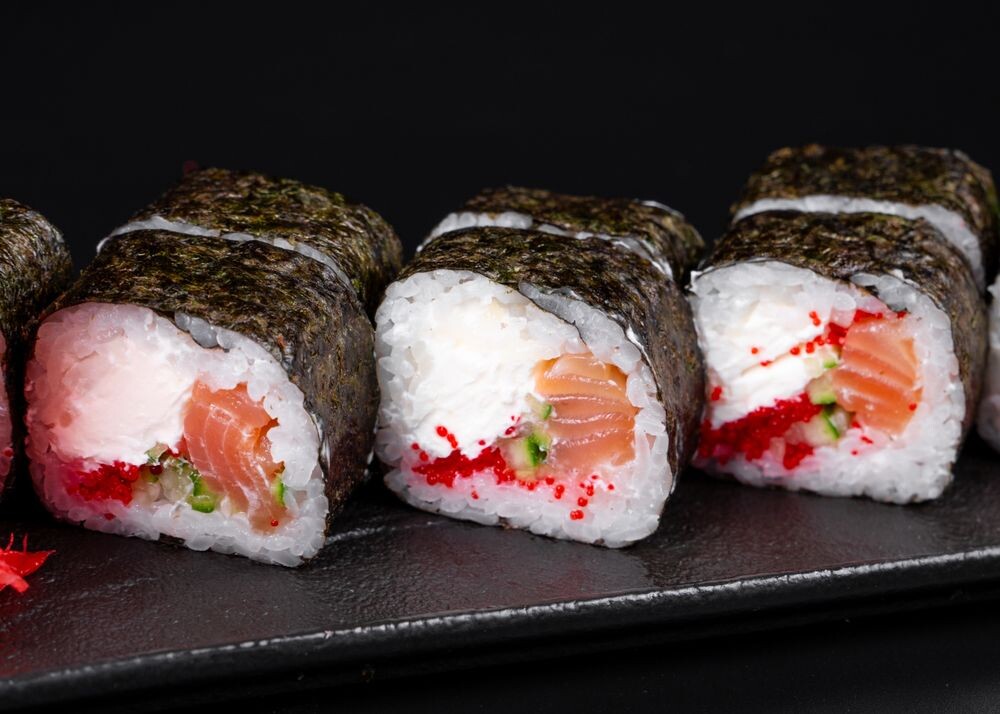 рис, нори, слабосоленный лосось, огурец, тобико, творожный сыр
