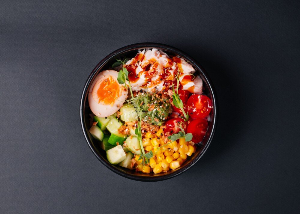 Рис, грудка в/к, кукуруза, черри, огурец, чука, ореховый соус, яйцо маринованное, кунжут, микрозелень