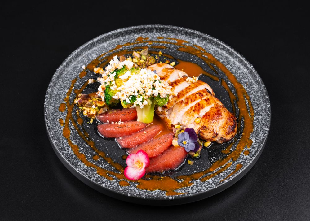грудка, грейпфрут, брокколи, попкорн, фисташки, соус облепиховый, свит чили