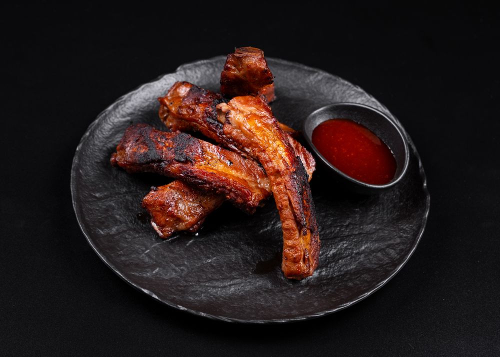 ребро свиное, свит чили, лук зеленый, перец чили, острый соевый соус