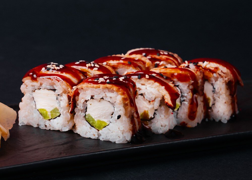 Копченый угорь, творожный сыр, дайкон, унаги, кунжут