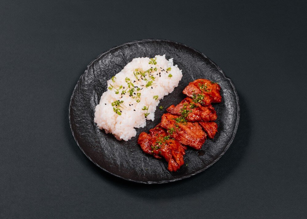 Вырезка свиная, соус, рис, кунжут, лук зеленый