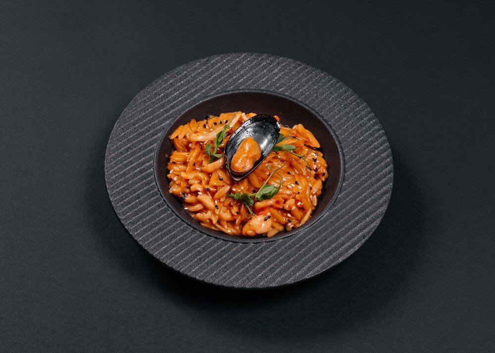 Паста орзо, креветки тигровые, кальмар, мидии, авокадо, сливки, устричный соус, кунжут, микрозелень