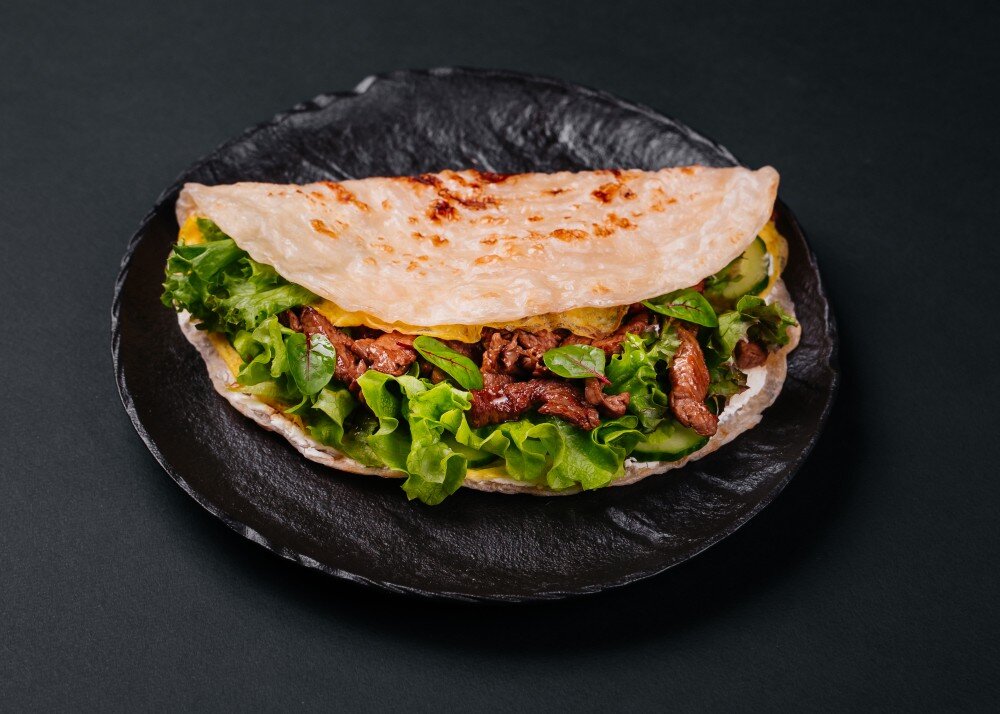 Индийская лепешка роти, говядина, творожный сыр, огурец, лист салата, омлет