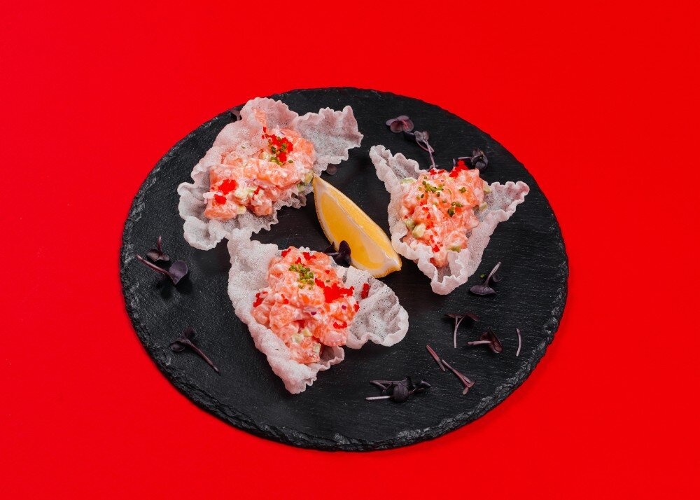 Лосось, красный лук, юдзу майонез, авокадо, рисовая бумага, тобико, микрозелень