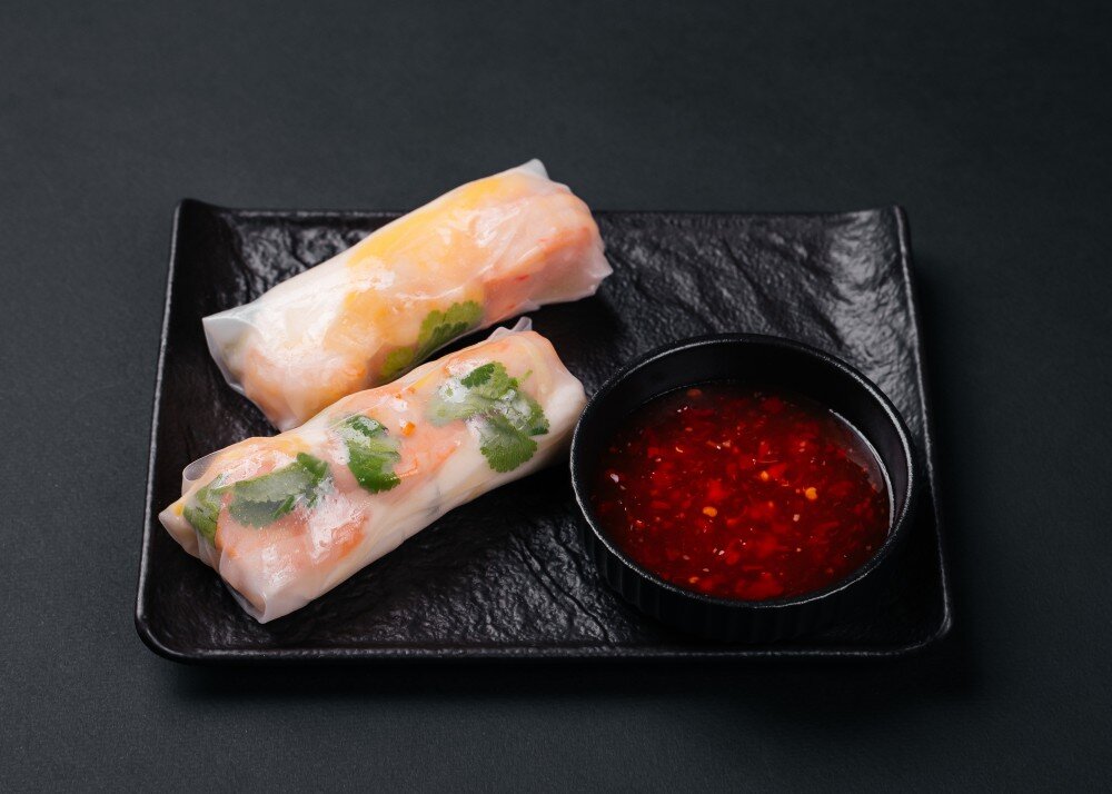 Рисовая бумага, огурец, манго свежий, сыр творожный, креветки, кинза, айсберг, подается с соусом сладкий чили