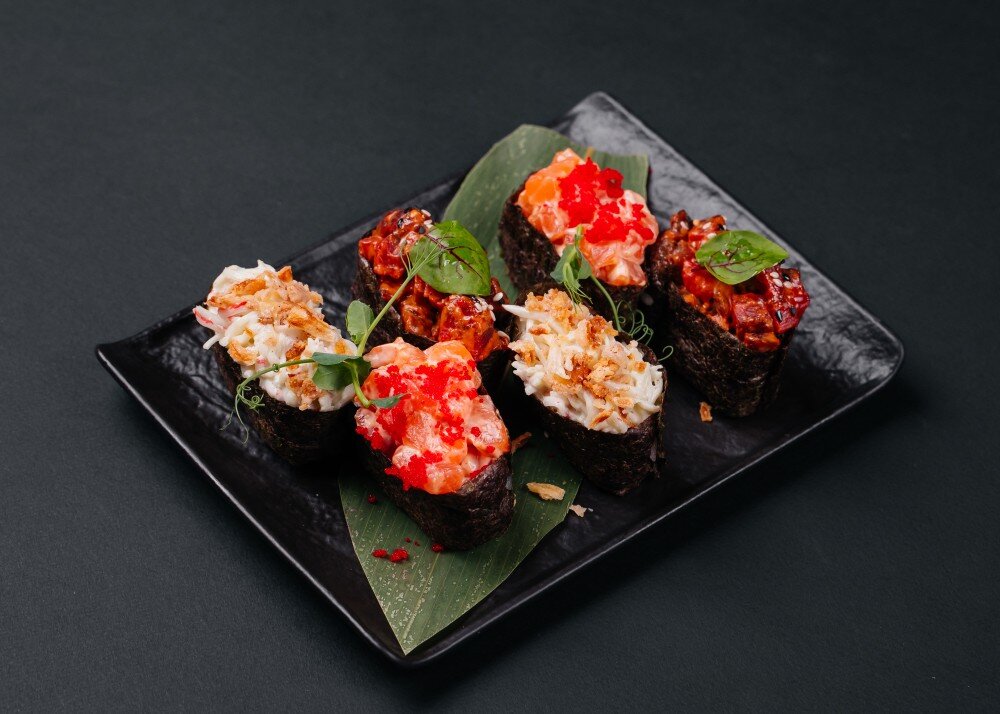 Рис, нори, лосось, спайси соус, крабовые палочки, васаби соус, говядина, перечный соус, лук фри, кунжут, тобико