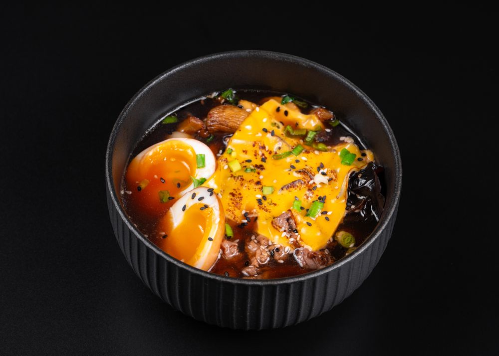 Бульон, говядина, лапша, маринованное яйцо, муэр, шампиньоны, сыр чеддер, кунжут, лук зеленый, масло чесночно имбирное