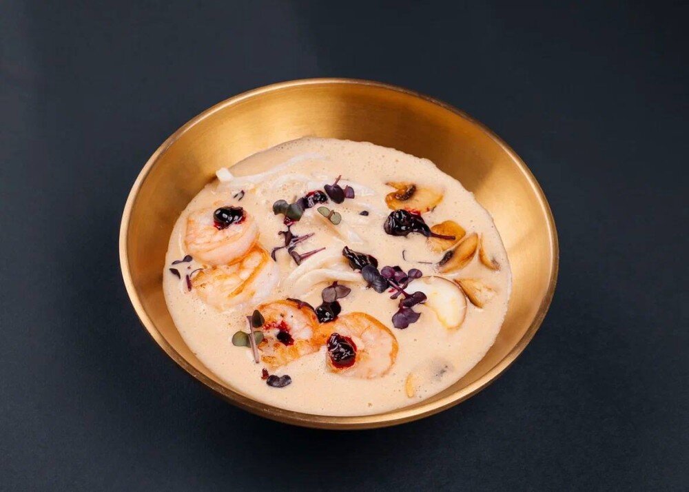Сырный бульон, креветки, шампиньоны, удон, маринованное яйцо, ягодный соус, микрозелень