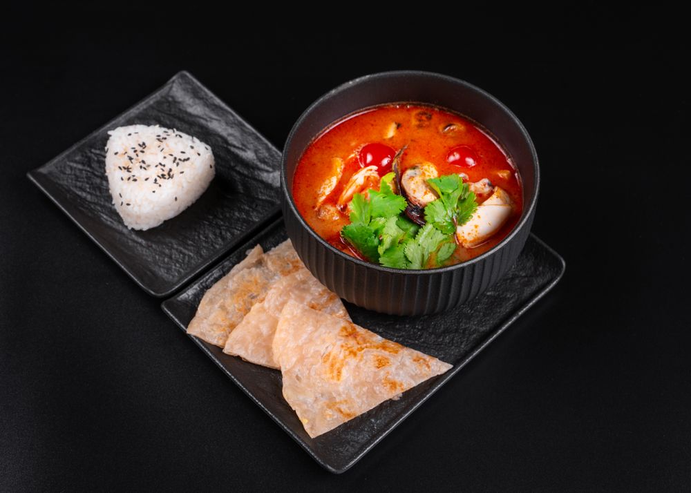 Бульон том ям, креветки, кальмар, мидии, осьминог, шампиньоны, кокосовое молоко, черри, кинза, рис, роти